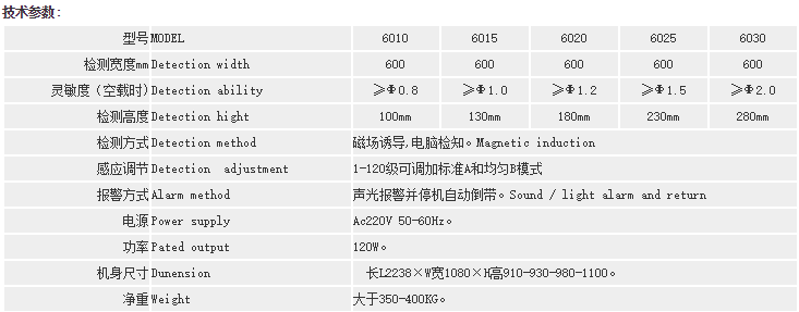 說明:檢針機靈敏度的高低由檢測高度(即通道或龍門)來決定最高檢測精度。龍門越高,靈敏度就相應(yīng)降低。以上對應(yīng)的高度和檢測標準是在空機狀態(tài)下的檢測結(jié)果;檢測通道高度和寬度,都可以按要求定做!