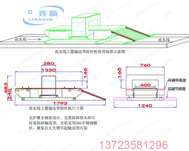 這是一款專門為流水線生產(chǎn)設(shè)計制作的輸送帶式檢針機(jī),可直接放置在流水線上使用進(jìn)行檢針驗針作業(yè),不需要改造流水線就可以加裝檢針機(jī),也不需要占用通道擺放檢針機(jī),節(jié)省使用空間節(jié)省檢針時間和效率。