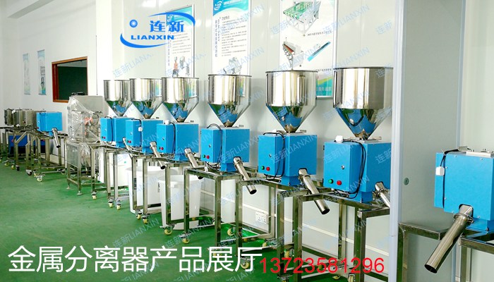 原料從料斗或送料器自由下落進入金屬分離器,如果沒有金屬雜質(zhì),原料會直接通過金屬分離器流向下端的出料口。如果檢測器檢測到原料中含有金屬,那么控制器立刻啟動分離板將金屬物和部分原料一起導向側(cè)面的排料口,然后分流板迅速恢復至正常的位置,分流板速度可調(diào),金屬分離器的檢測精度也可根據(jù)生產(chǎn)需要調(diào)節(jié),最小可檢測并分離出Φ 0.2mm的金屬顆粒。