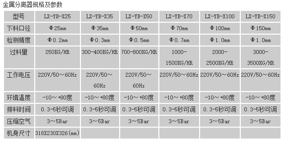 原料從料斗或送料器自由下落進(jìn)入金屬分離器,如果沒有金屬雜質(zhì),原料會直接通過金屬分離器流向下端的出料口。如果檢測器檢測到原料中含有金屬,那么控制器立刻啟動分離板將金屬物和部分原料一起導(dǎo)向側(cè)面的排料口,然后分流板迅速恢復(fù)至正常的位置,分流板速度可調(diào),金屬分離器的檢測精度也可根據(jù)生產(chǎn)需要調(diào)節(jié),最小可檢測并分離出Φ 0.2mm的金屬顆粒。