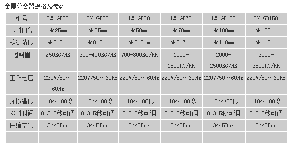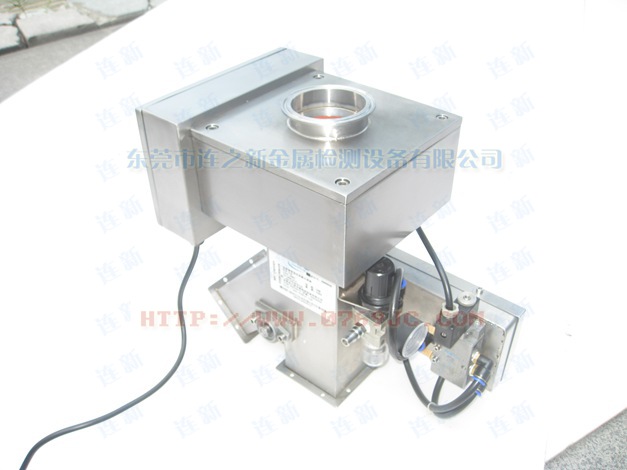 原料從料斗或送料器自由下落進(jìn)入金屬分離器,如果沒有金屬雜質(zhì),原料會直接通過金屬分離器流向下端的出料口。如果檢測器檢測到原料中含有金屬,那么控制器立刻啟動(dòng)分離板將金屬物和部分原料一起導(dǎo)向側(cè)面的排料口,然后分流板迅速恢復(fù)至正常的位置,分流板速度可調(diào),金屬分離器的檢測精度也可根據(jù)生產(chǎn)需要調(diào)節(jié),最小可檢測并分離出Φ 0.2mm的金屬顆粒。