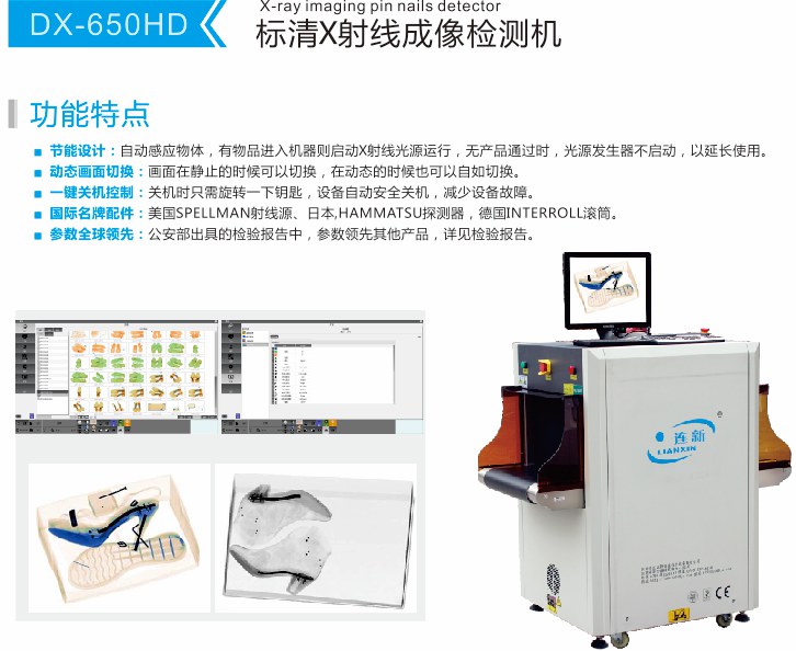 功能特點:DX-650HD X光鞋子驗針機,是一款標清的X光驗針釘設備,適合用于鞋子手袋箱包等工業(yè)生產(chǎn)質量檢測場所,是檢品環(huán)節(jié)一款重要的檢測儀器。